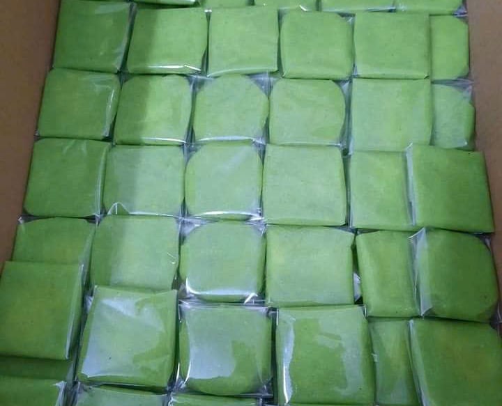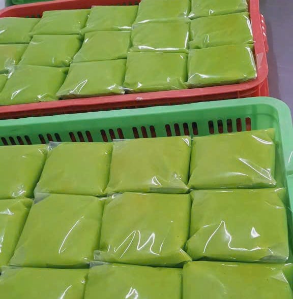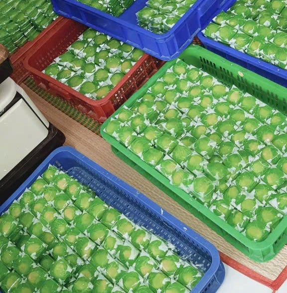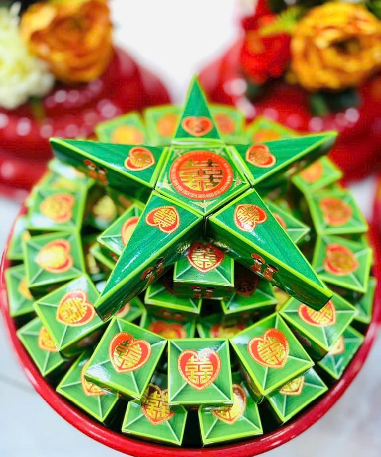 Bánh cưới hỏi Vương Ngọc Lan mang đến sản phẩm truyền thống kết hợp phong cách hiện đại, với màu sắc kem, xanh lá, đỏ và vàng.